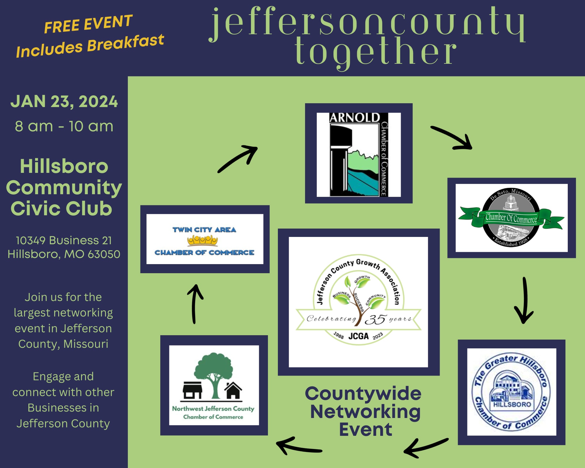 Countywide Networking Event ~ Engage and Connect with other Businesses in Jefferson County! The JCGA in collaboration with the Arnold, De Soto, Festus, Hillsboro & Northwest Chambers, have created an extraordinary opportunity for you to expand your connections with other local businesses. Learn about your local Chambers and the Jefferson County Growth Association, and what they can do to help grow your business.